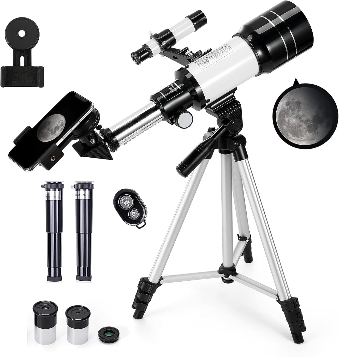 70mm Large Aperture: This refractor telescope is equipped with a 70mm objective lens and a 300mm focal length, gathering more light to deliver bright, clear, and sharp images of the moon’s craters and stars.