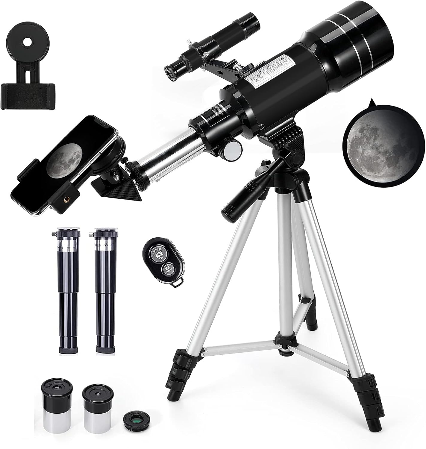 70mm Large Aperture: This refractor telescope is equipped with a 70mm objective lens and a 300mm focal length, gathering more light to deliver bright, clear, and sharp images of the moon’s craters and stars.
